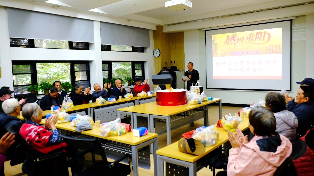秋意正浓,情暖重阳。10月29日,材料学院在逸夫技科楼A205会议室举办重阳节离退休教职工集体祝寿活动,以实际行动传承尊老敬老的优良传统,并向老同志们致以最诚挚的节日问候与美好祝福。院党委书记杨志刚、院长林元华等党政领导班子出席,40余名离退休及在职教职工参加。活动由院党委副书记、工会主席张弛主持。
