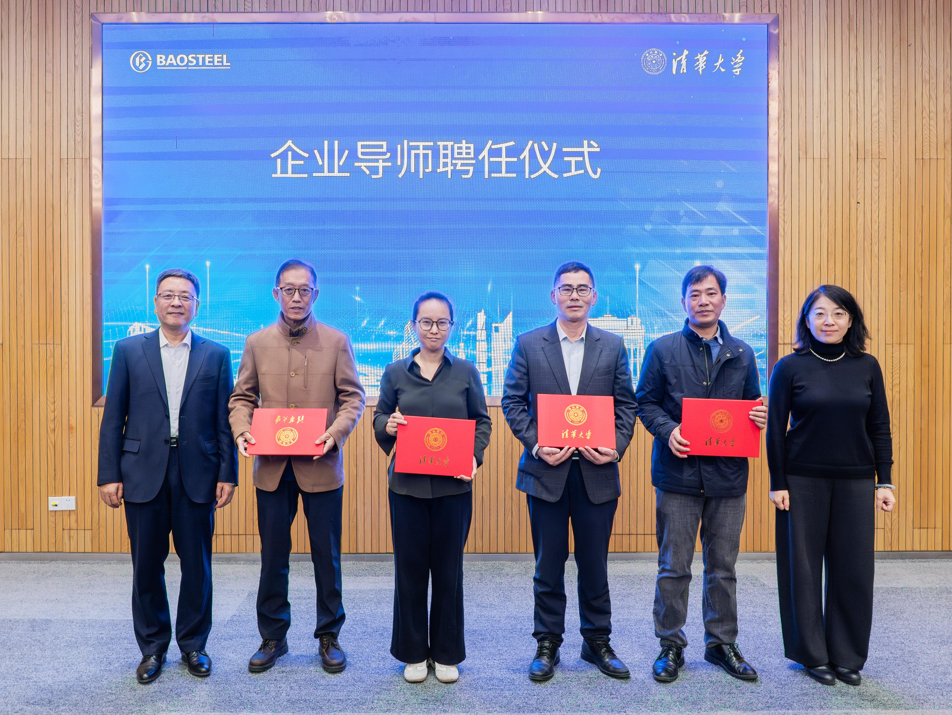 在企业导师聘任仪式上,清华大学相关领导为新聘任企业导师白树林(京津冀国家技术创新中心)、罗晋如(长三角先进材料研究院)、张忠铧及金鑫焱(宝钢股份中央研究院)颁发聘书(左二至右二)。此次聘任为工程博士培养注入新的动力,搭建起校企导师共育人才的坚实桥梁。