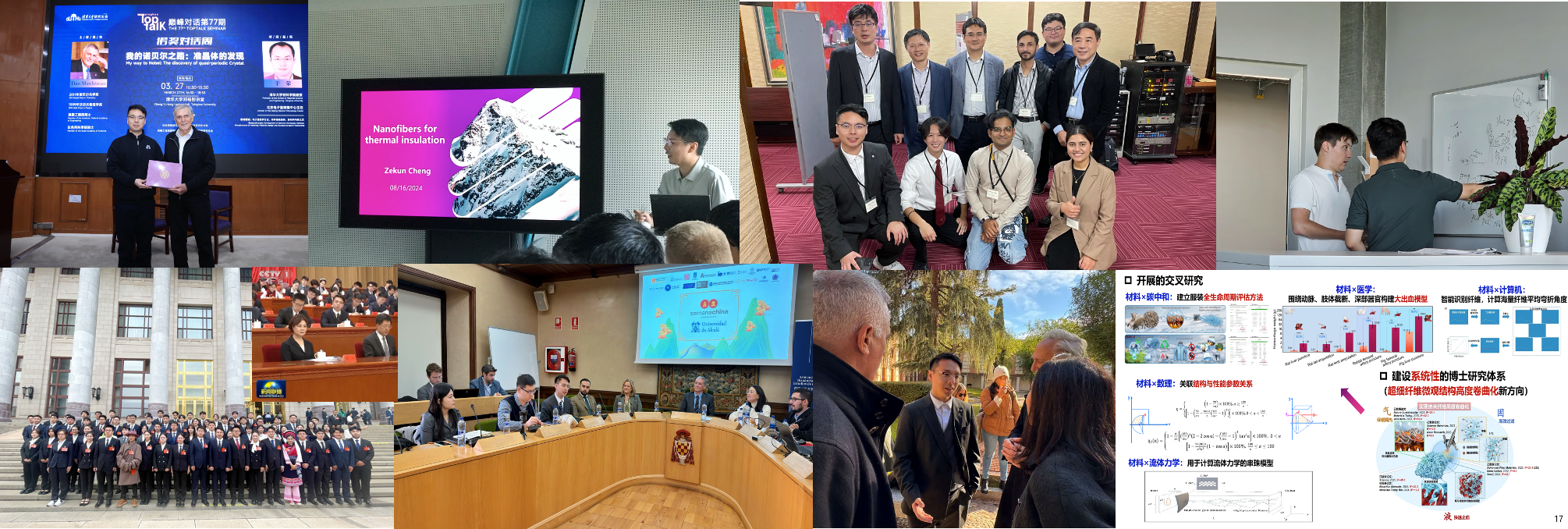 多元的国际交流平台同样是交叉融合的沃土,可以广泛吸收来自全球的前沿观点。他于2024年通过辅导员海外研修计划,前往苏黎世联邦理工大学、瑞士联邦材料科学与技术研究院交换学习,也曾前往东京科学大学等高校开展学术报告,深刻感受到国际交流能够帮助系统理解创新平台建设的优势举措和前沿科学技术的创新角度。他与小伙伴们积极邀请诺贝尔化学奖得主丹·谢赫特曼(准晶体之父,Dan Shechtman)与诺贝尔物理学奖得主塞尔日·阿罗什(囚禁光子的量子实验大师,Serge·Haroche)线下来到清华园与青年面对面交流,这也是时隔五年,再次以研会为主办单位邀请诺奖嘉宾线下与青年对话,2025年线上线下已累计邀请7位诺贝尔奖和图灵奖获得者与同学们交流。