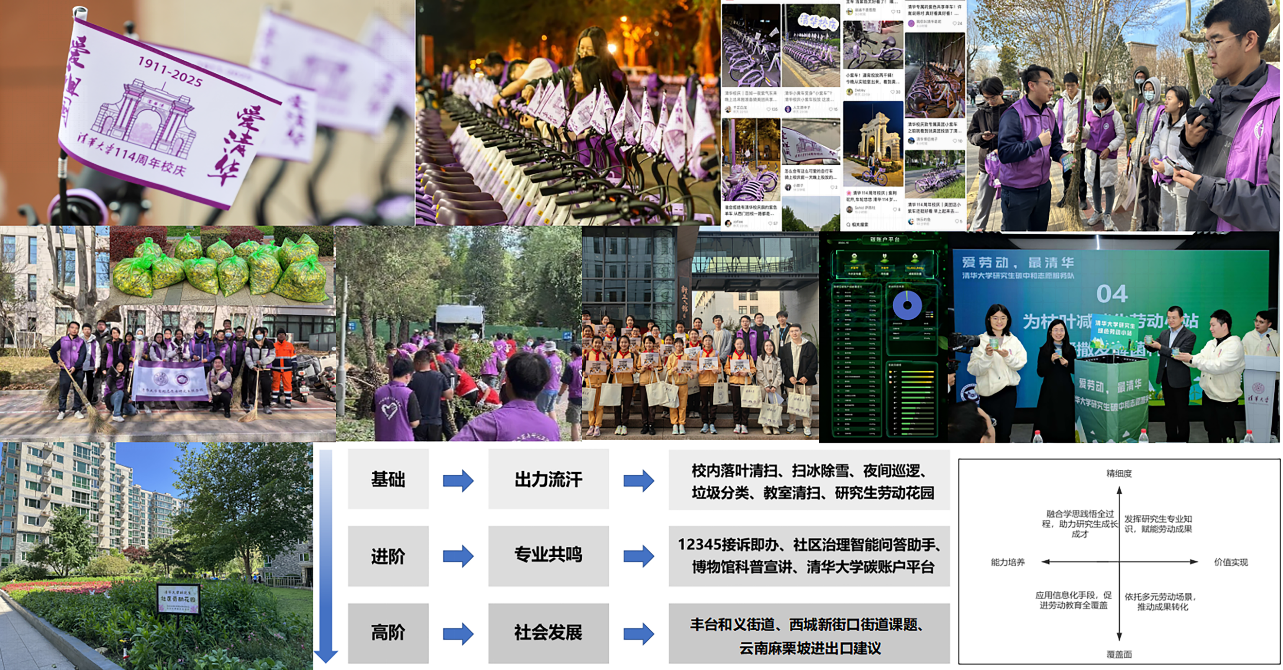 图9 “爱祖国,爱清华”校庆旗帜、落叶清扫与断枝清障等劳动教育与志愿服务、碳账户平台、低碳劳动小站