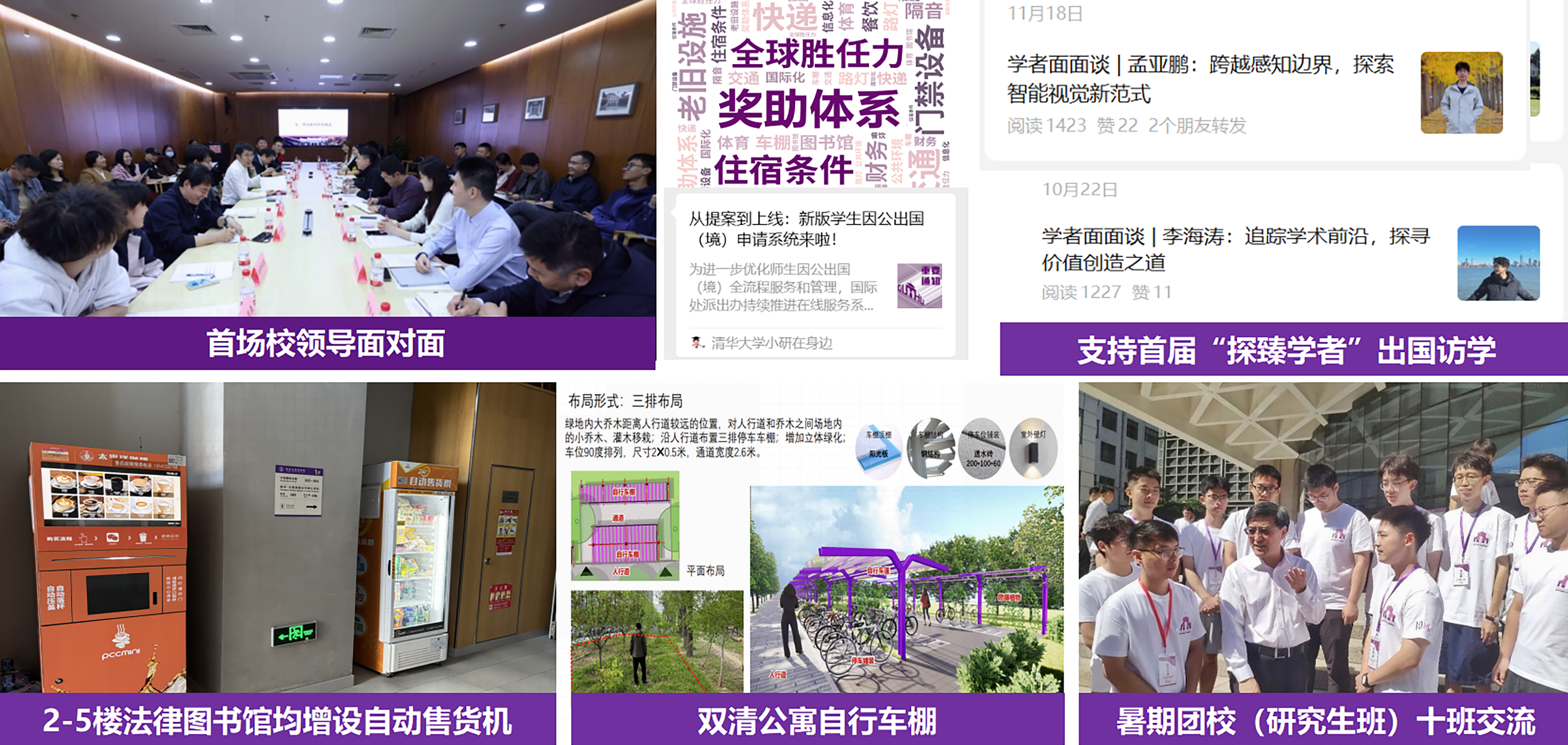 图10 “校领导面对面”生活权益反馈、支持研究生国际交流相关举措落地、首届“探臻学者”海外访学、自动售货机与自行车棚等同学诉求推进解决、暑期团校带班交流