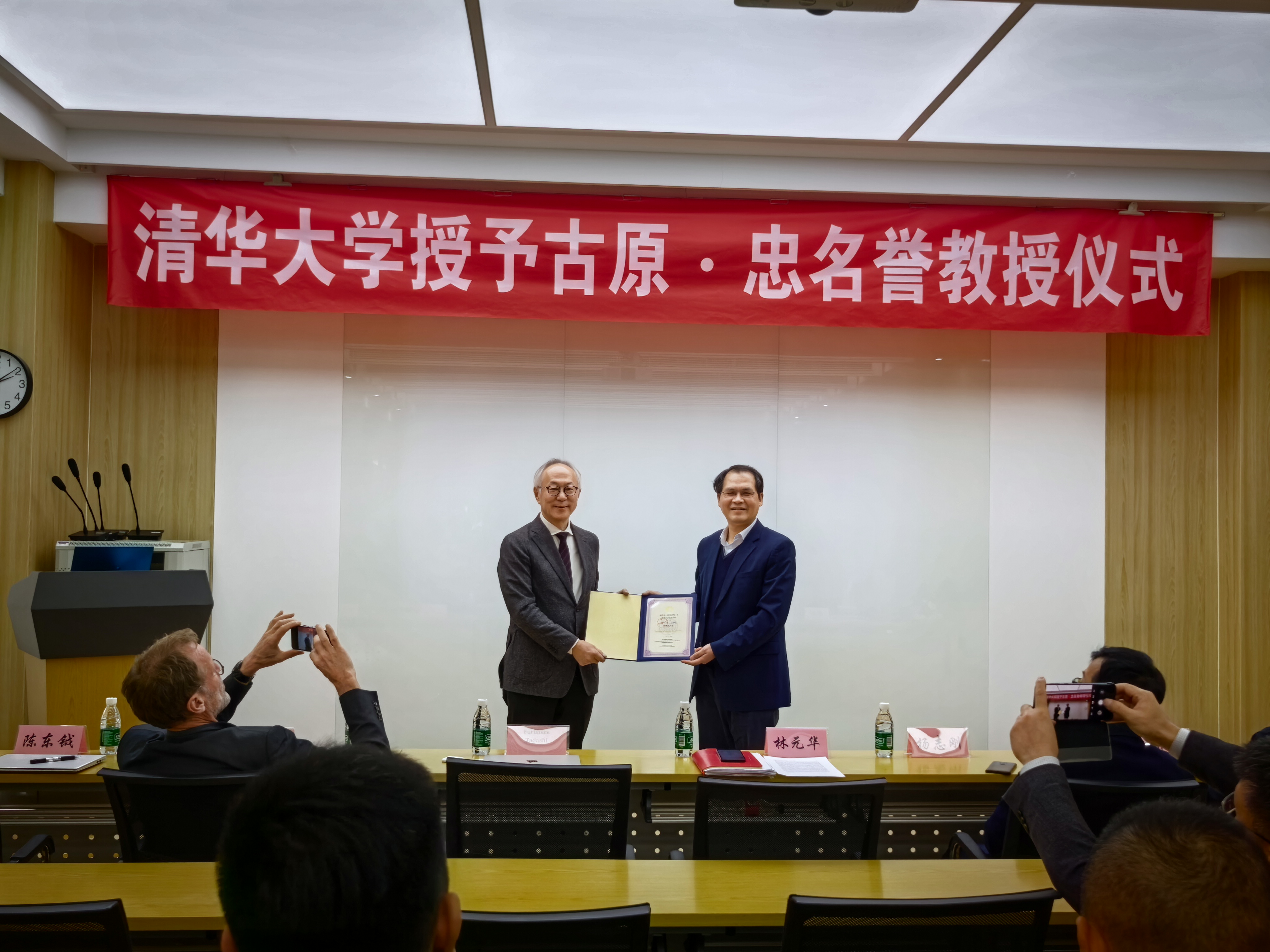 On the afternoon of November 17th, the Tsinghua University Honorary Professor Appointment Ceremony was held at Yifu Technical Building of the School of Materials Science and Engineering (MSE), Tsinghua University. Professor Tadashi Furuhara from the Institute for Materials Research (IMR) at Tohoku University, Japan, was officially appointed as Honorary Professor of Tsinghua University and delivered an academic lecture. The ceremony was attended by Prof. Lin Yuanhua, Dean of MSE; Prof. Yang Zhigang, Party Secretary of MSE; Prof. Sybrand van der Zwaag, fellow of Royal Society for Science in the Netherlands, honorary distinguished professor of Delft University of Technology; among other guests.